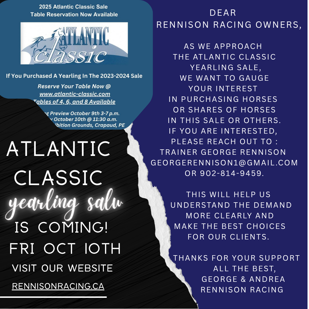 As we approach the Atlantic Classic Yearling Sale, we want to gauge your interest in purchasing horses or shares of horses in this sale or others. If you are interested, please reach out to George Rennison at georgerennison1@gmail.com or call him at 902-814-9459.