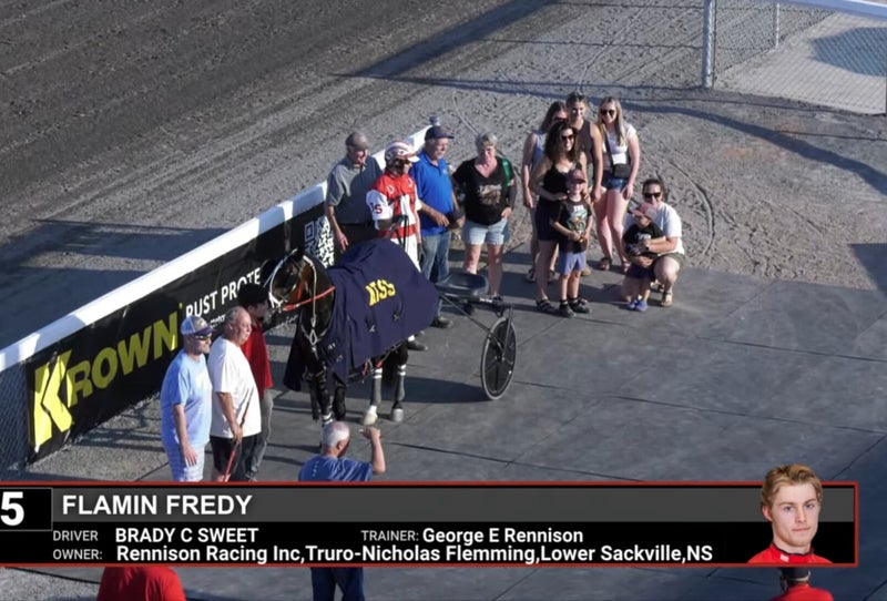Today we added the most amazing person and her family to the Rennison Racing Team. Faith Mitchum came all the way from Newfoundland to Truro Nova Scotia! Faith has a long history of harness racing involvement including ownership and jogging of her very own race horses. Today Faith met the man who gave her the very first horse she ever owned , Greg Munroe. Later Faith dressed in her new racing silks and joined Ryder in the two seater aboard Judicial. They fought off Carl Isenor with Top Of Her Trade and George with Electric Syl. Faith was presented a cooler and bouquet of flowers in the winners circle. Stay Tuned to updates as she attends the race card in Truro Friday Evening!