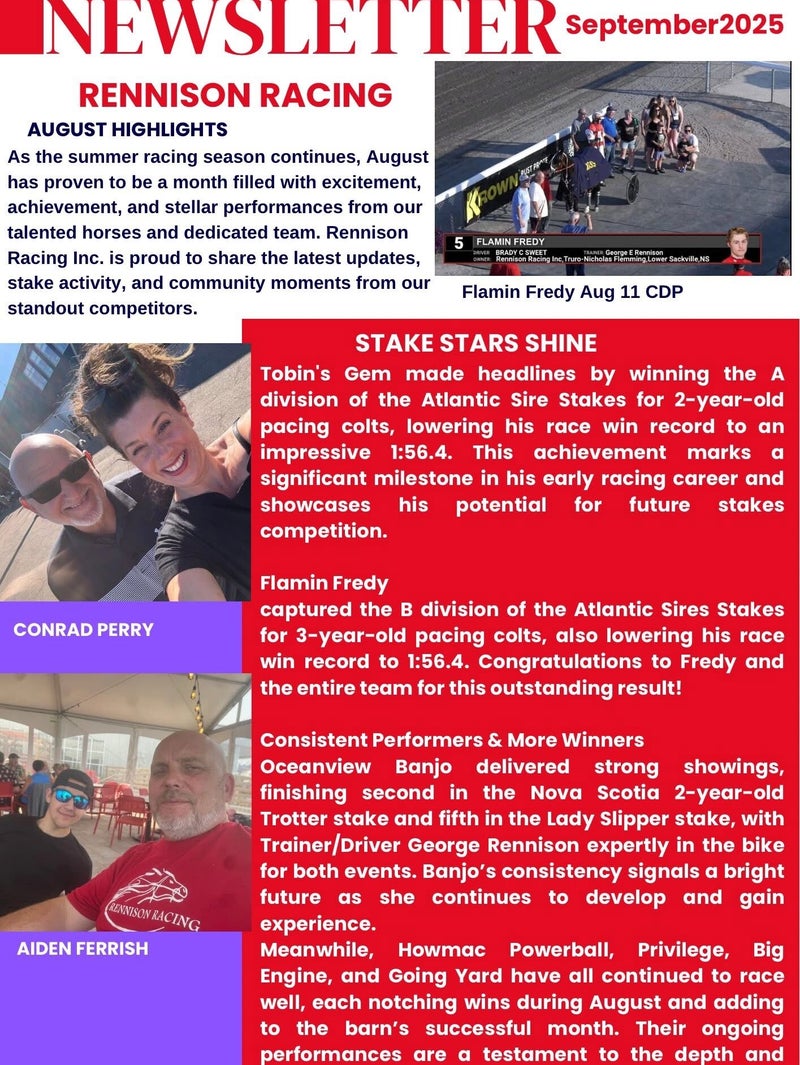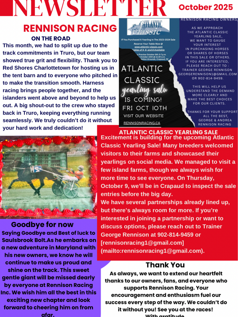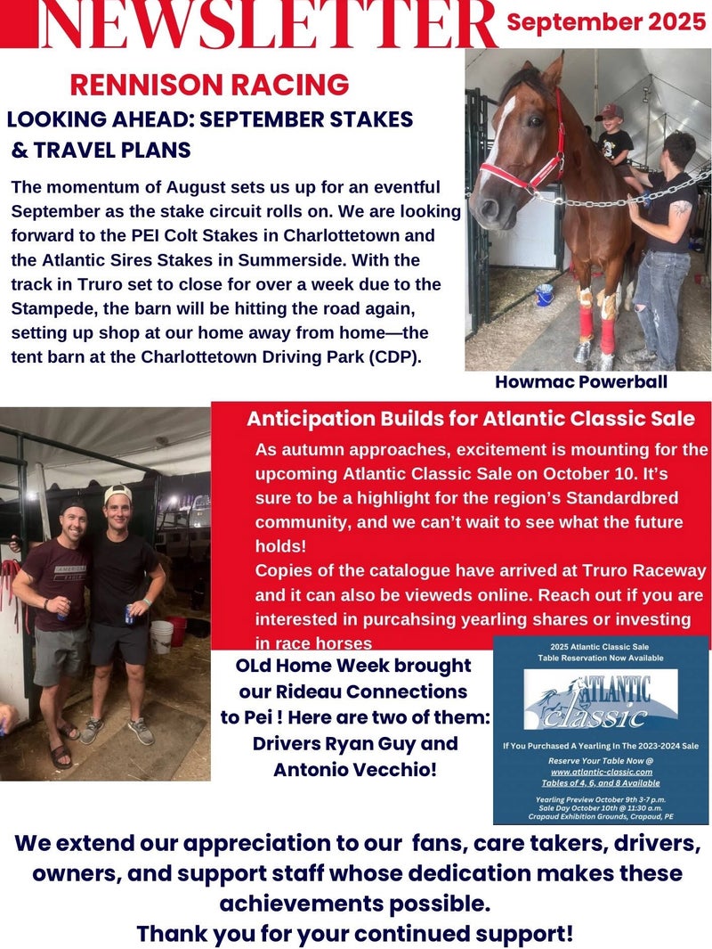 As we approach the Atlantic Classic Yearling Sale, we want to gauge your interest in purchasing horses or shares of horses in this sale or others. If you are interested, please reach out to George Rennison at georgerennison1@gmail.com or call him at 902-814-9459.