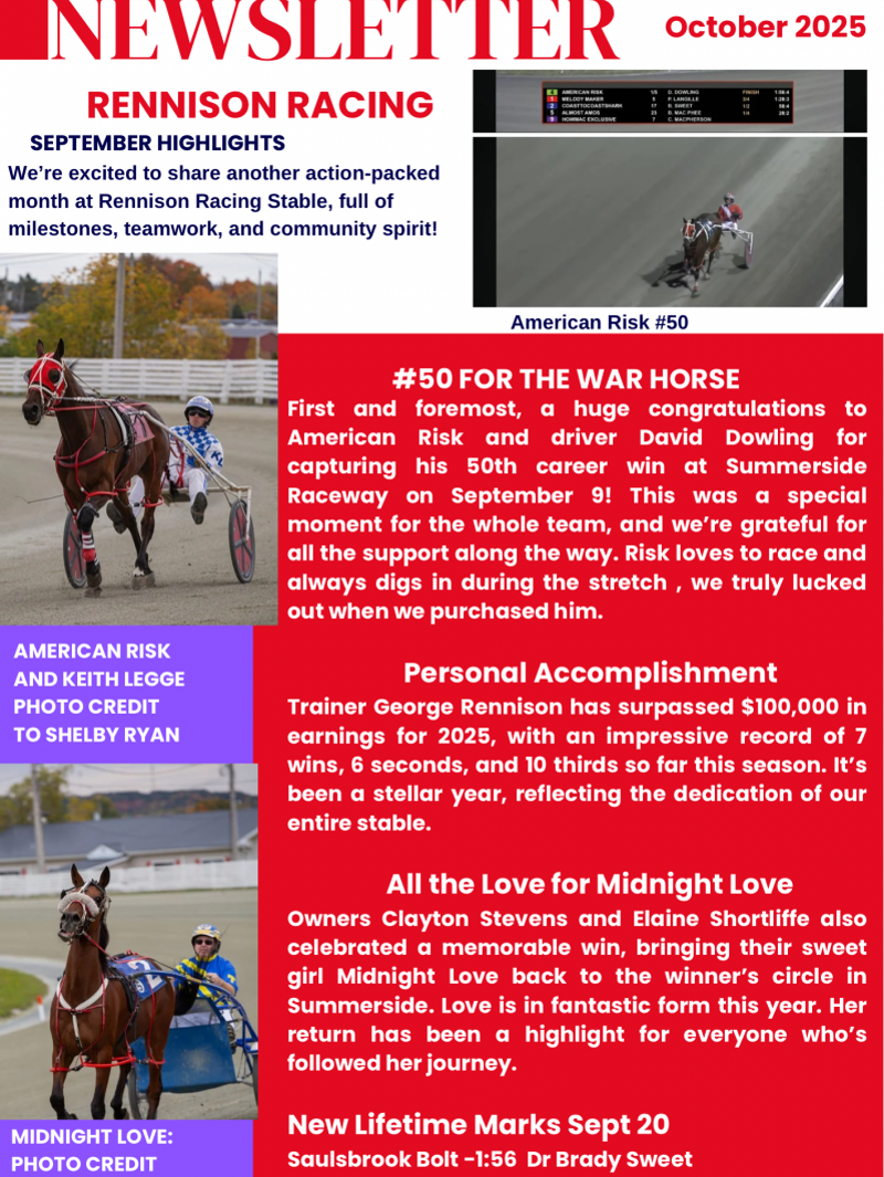 Welcome to the Rennison Racing Update Board, your one-stop destination for all the latest and greatest news in the electrifying world of harness racing! From heart-stopping finishes to heartwarming moments, this board is where the magic happens, keeping you in the loop and at the edge of your seat with every update. So, whether you're a die-hard fan or just dipping your toes into the exciting world of harness racing, buckle up and join us for an exhilarating ride on the Rennison Racing Update Board!